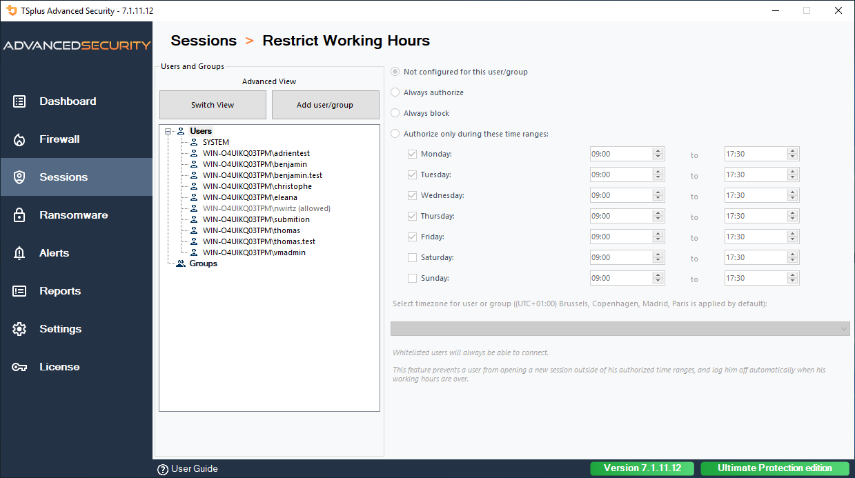 Only authorize users or groups to connect during certain days and timeslots. It is possible to select a specific time zone depending on your user's office location.